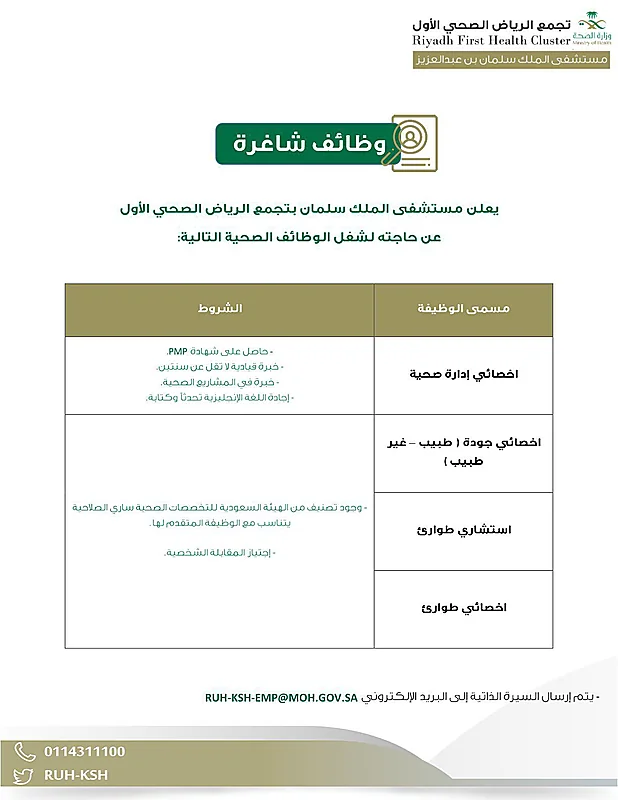 واشترط على المتقدم لشغل هذه الوظائف أن يتوافر لديه خبرة لا تقل عن سنتين في التخصص ، ووجود تصنيف من الهيئة السعودية للتخصصات الصحية ساري الصلاحية، وضرورة اجتياز المقابلة الشخصية كما يشترط للمتقدمين على وظيفة اخصائي الإدارة الصحية الحصول على شهادة اداره المشاريع الاحترافيه )PMP مع خبرة عمليه بالمشاريع الصحية لا تقل عن سنتين في مركز قيادي مع اجادة اللغة الانجليزية .