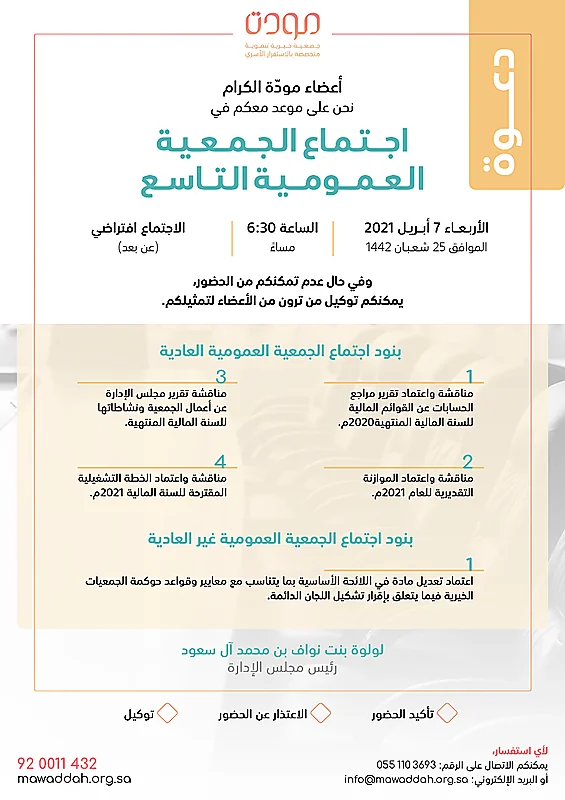 تعتزم جمعية مودة الخيرية التنموية والمتخصصة بالاستقرار الأسري عقد اجتماع جمعيتها العمومية التاسع، وقد حددت الجمعية مساء الأربعاء المقبل السابع من إبريل، والموافق 25 من شعبان موعداً لانعقادها؛ حيث ستترأس صاحبة السمو الأميرة لولوة بنت نواف آل سعود رئيسة مجلس الإدارة الاجتماع، بحضور أعضاء المجلس والجمعية العمومية وعدد من رجال الأعمال والعاملين في الجمعية والمهتمين.